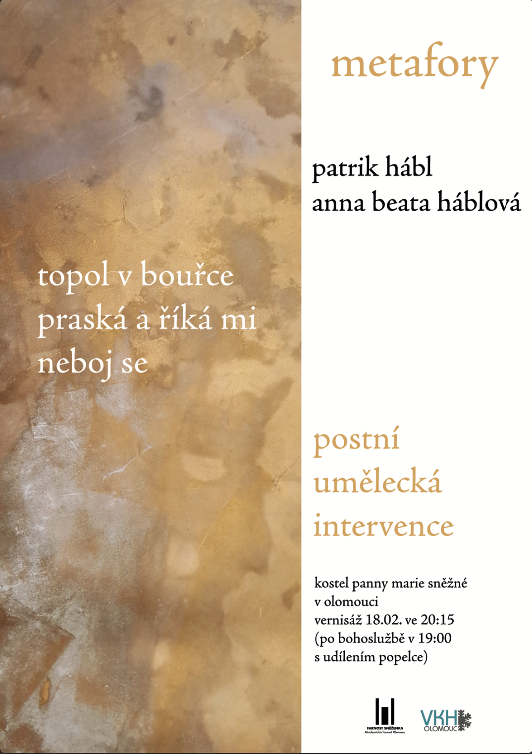 Již 18. února oslavíme Popeleční středu studentskou bohoslužbou v 19.00 v kostele Panny Marie Sněžné a na prahu postní doby budeme všichni označeni popelem, symbolem pokání a obrácení. Akademická farnost Olomouc při té příležitosti již poosmé pozvala do prostoru kostela současné umělce, aby na několik týdnů barokní interiér kostela obohatili o uměleckou intervenci. V letošním roce farnost navázala spolupráci s tvůrčím duem - malířem, spisovatelem a vysokoškolským pedagogem Patrikem Háblem a spisovatelkou, slamerkou, básnířkou, hudebnicí, vizuální umělkyní, architektkou a úřadující básnířkou města Prahy 2026 Annou Beatou Háblovou.
